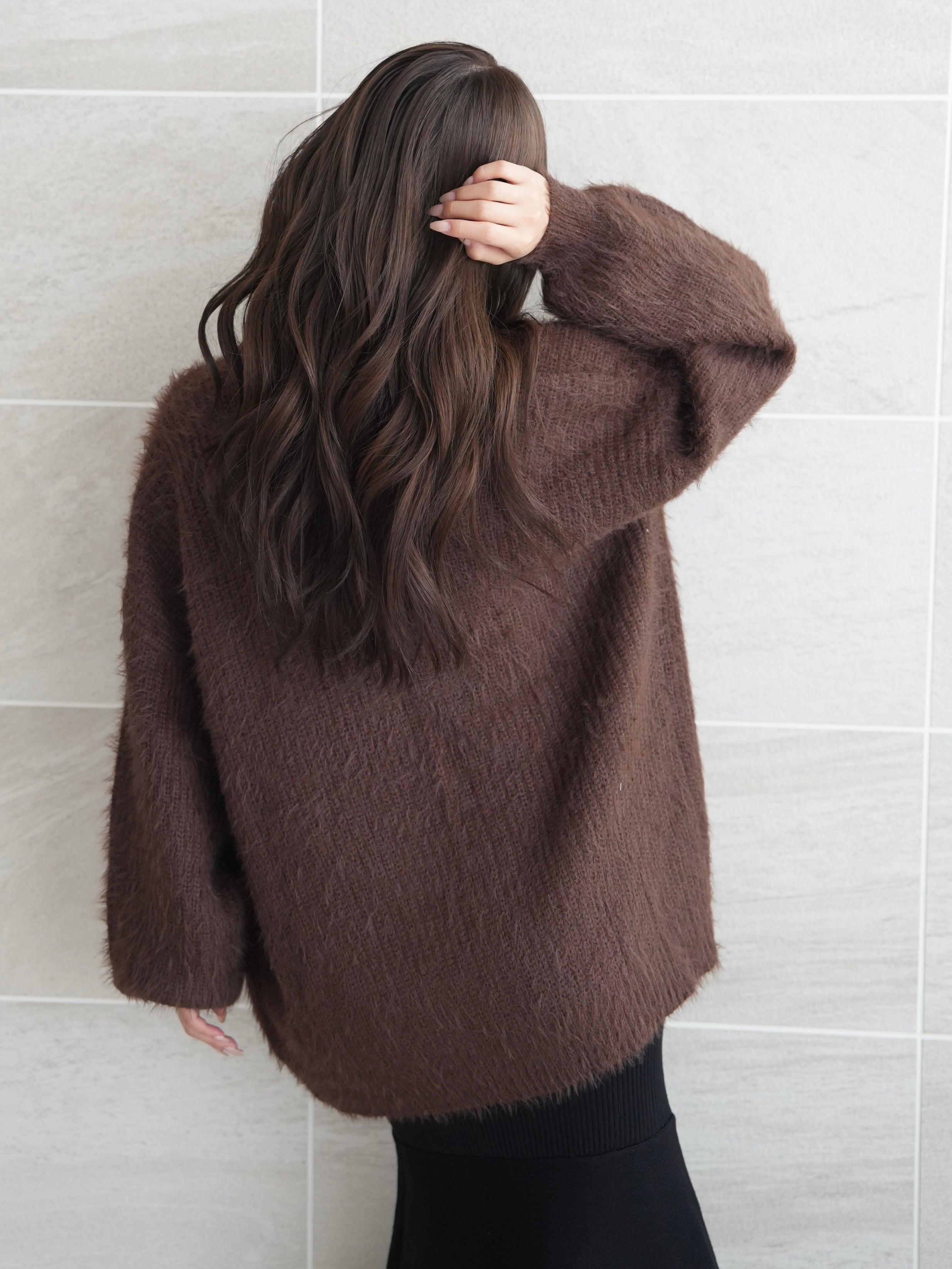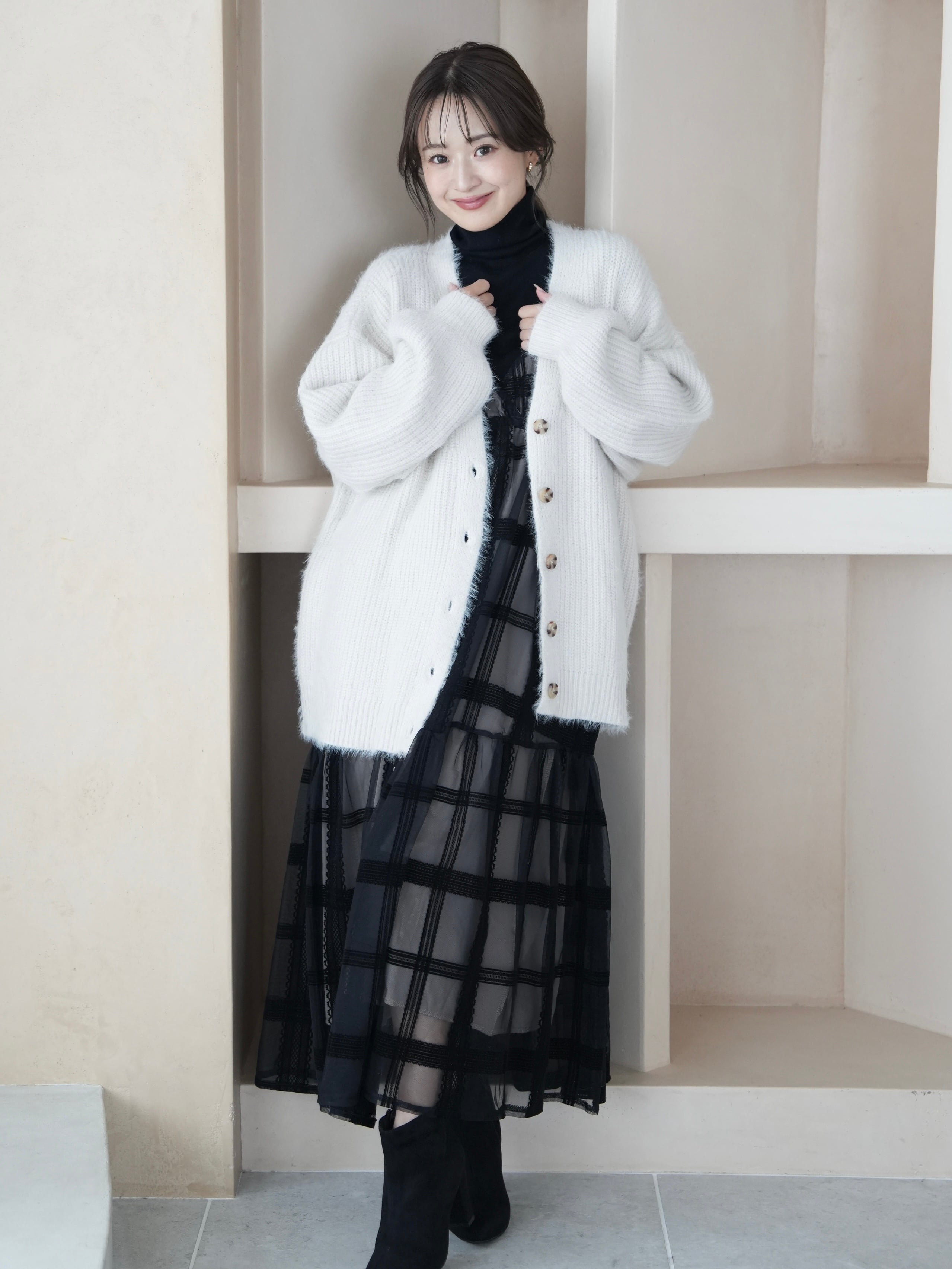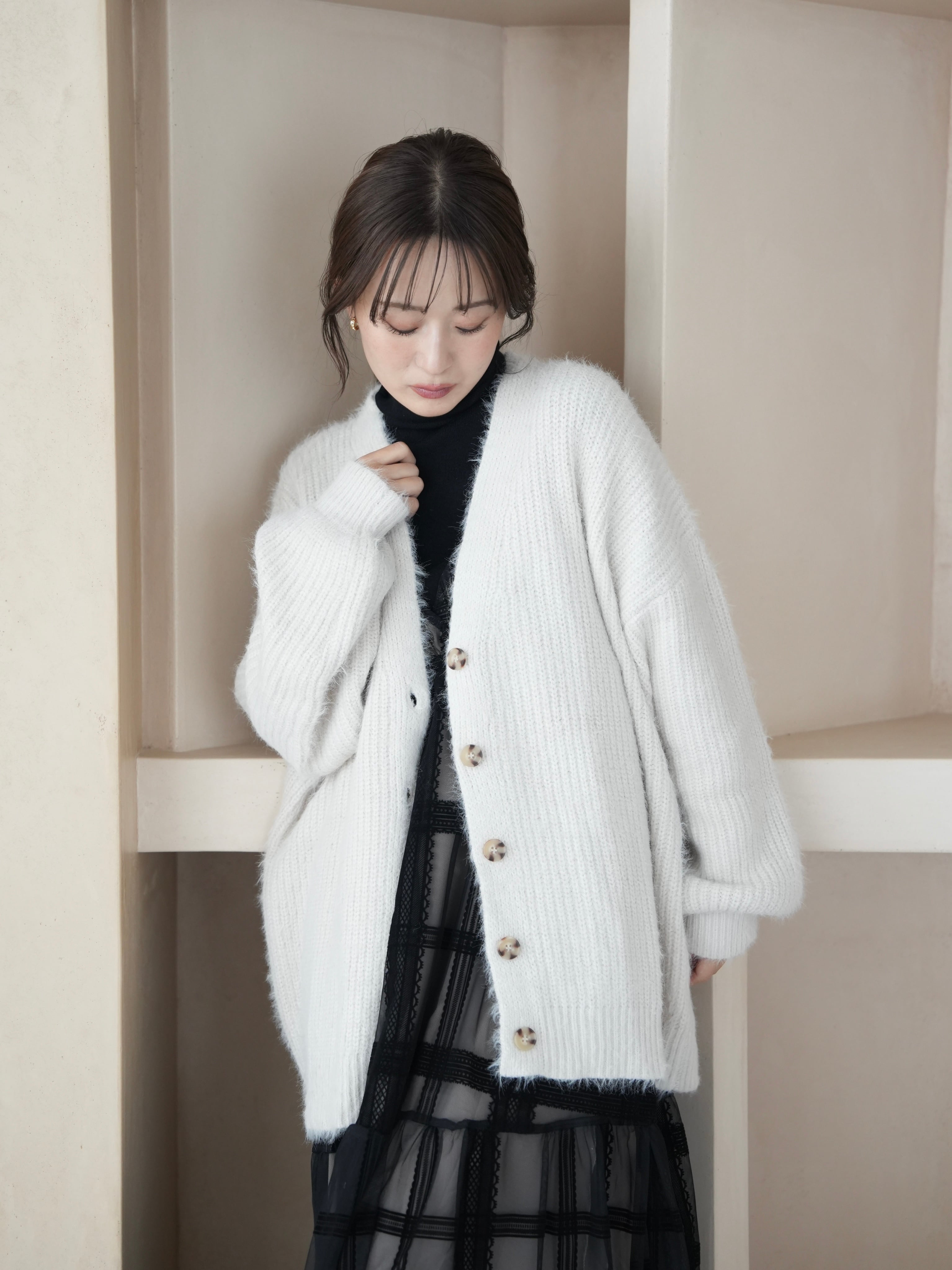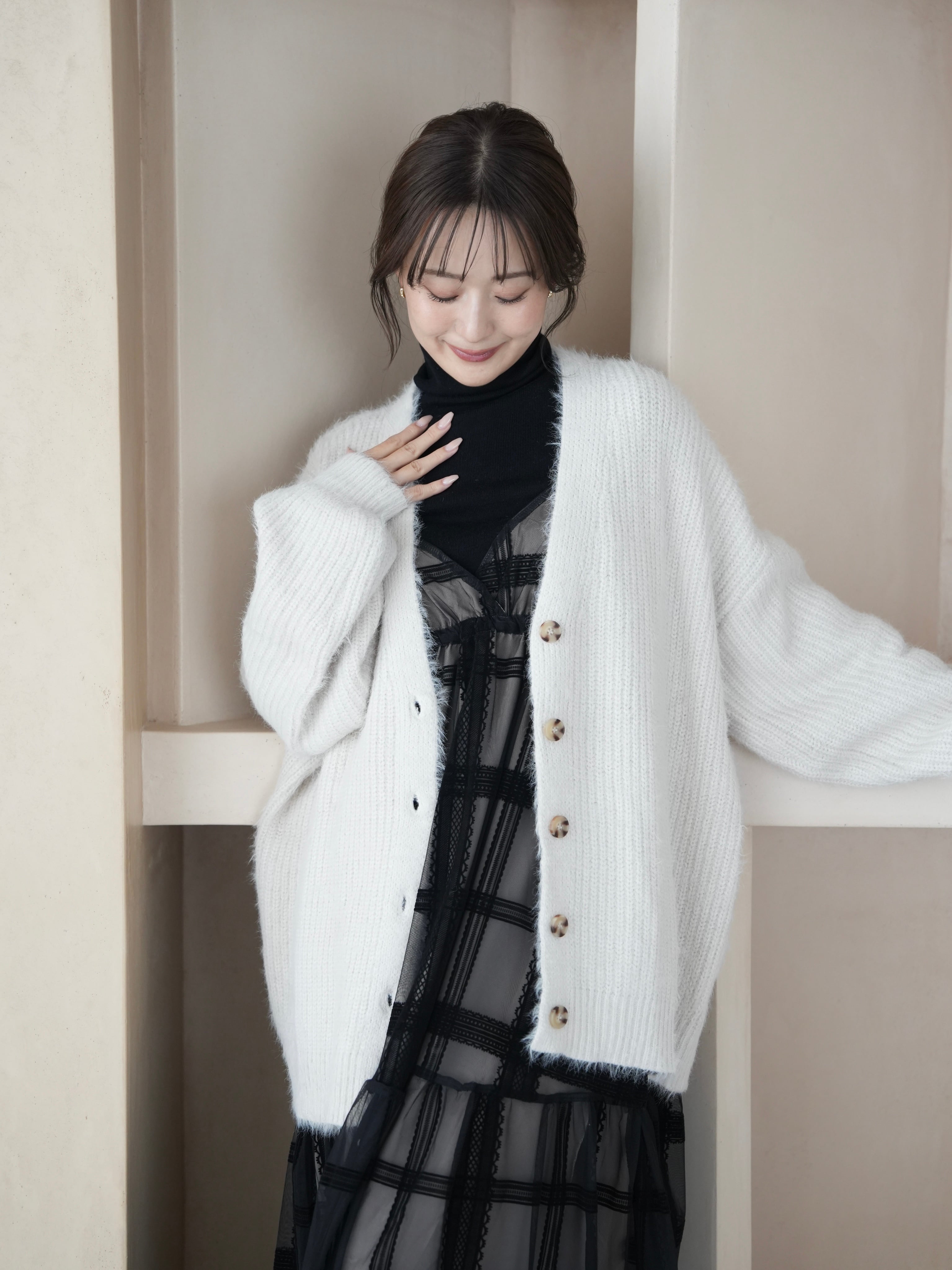 羽のように柔らかいフェザーヤーン素材は、羽織るだけで女性らしいニュアンスを演出します。