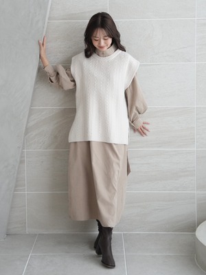 やさしいアイボリーカラーが、コーデ全体に明るさをプラスしてくれるニットベスト。