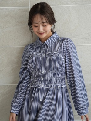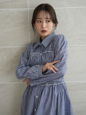 清潔感のあるブルーストライプが、顔まわりを明るく見せてくれる1枚。