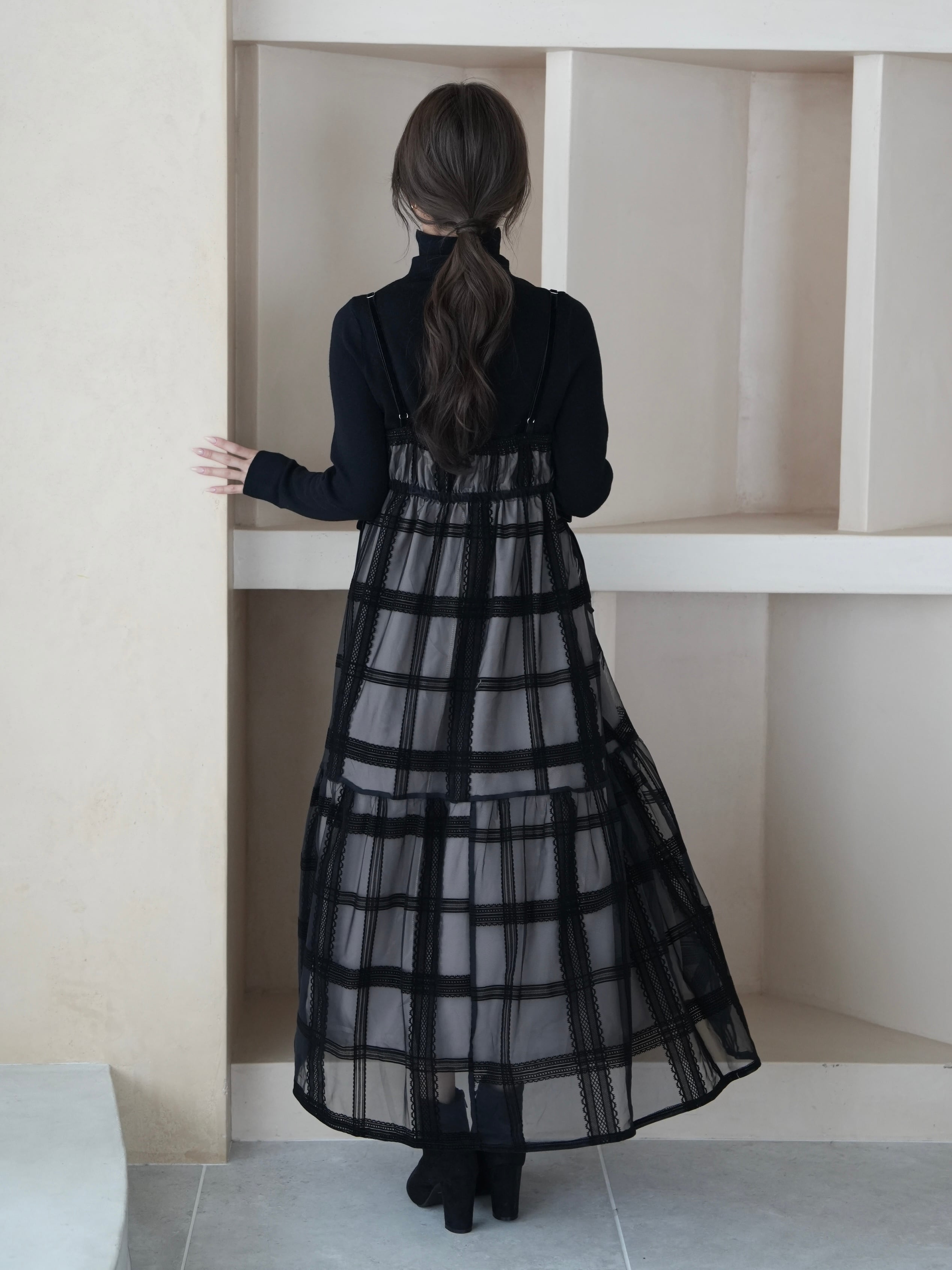 秋冬らしいフロッキープリントを施した、レースのようなチェック柄が目を惹くキャミワンピース。