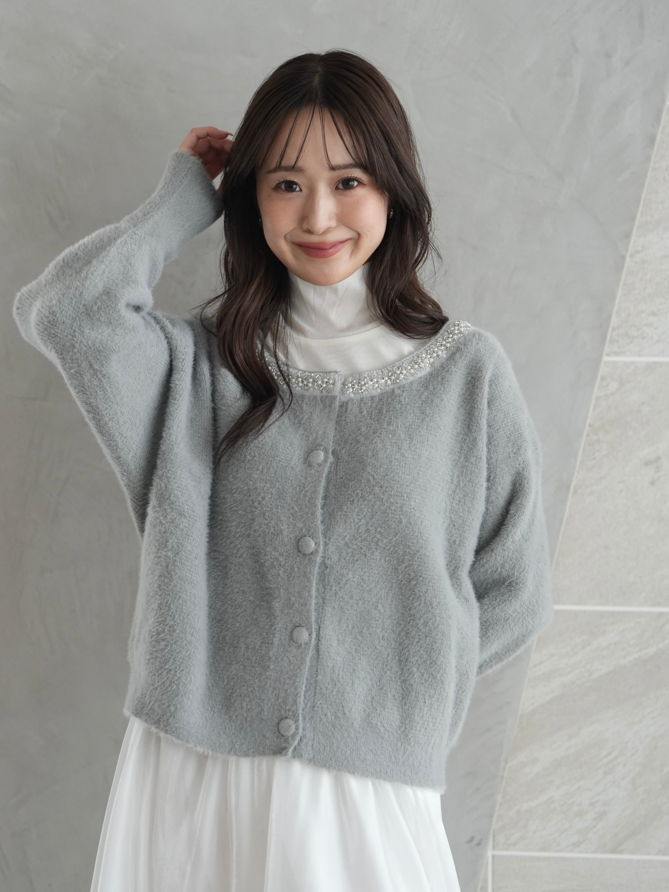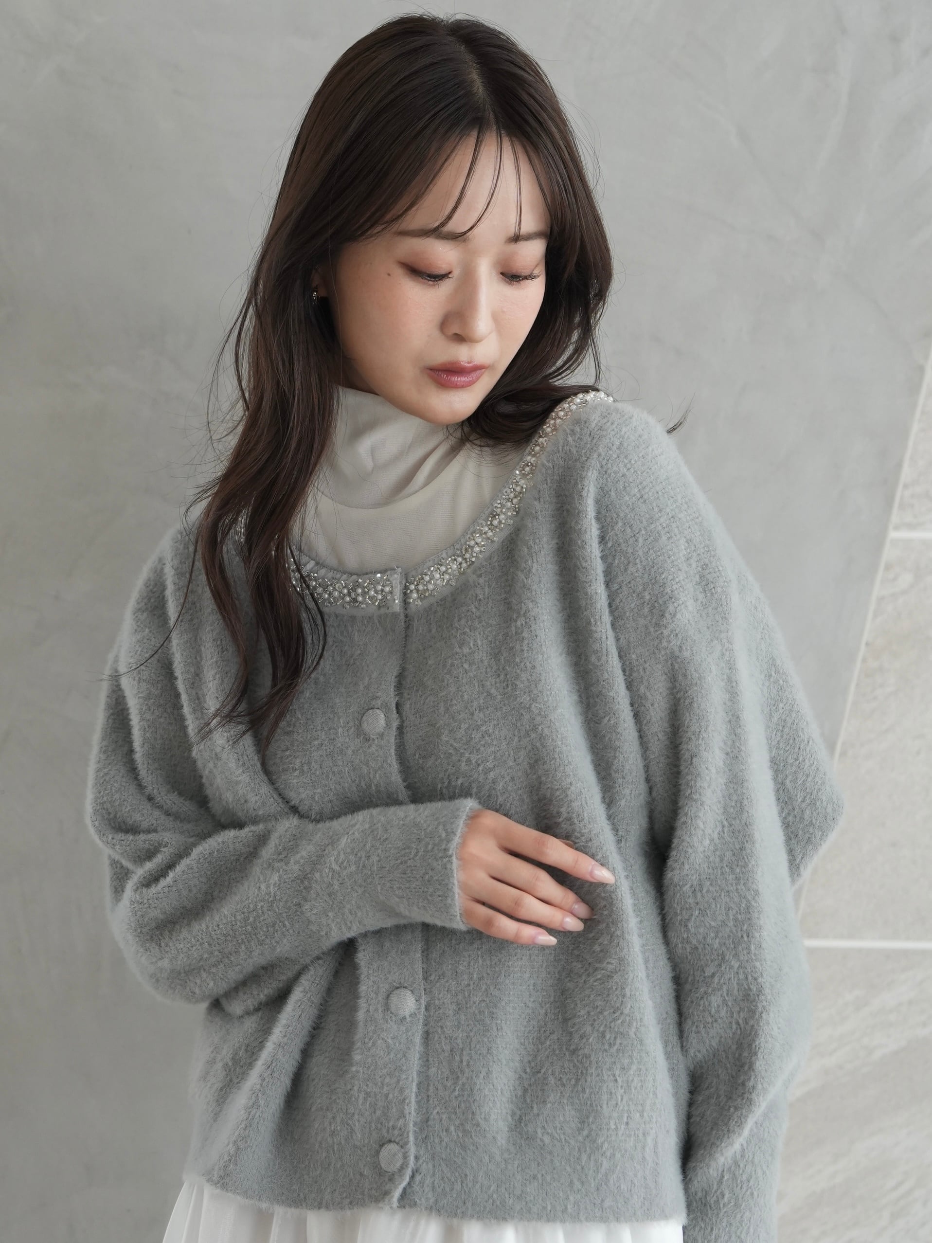 あなたの冬のワードローブに、ビジュー襟シャギーニットカーディガンをプラスして、特別な日の装いを楽しんでみませんか?