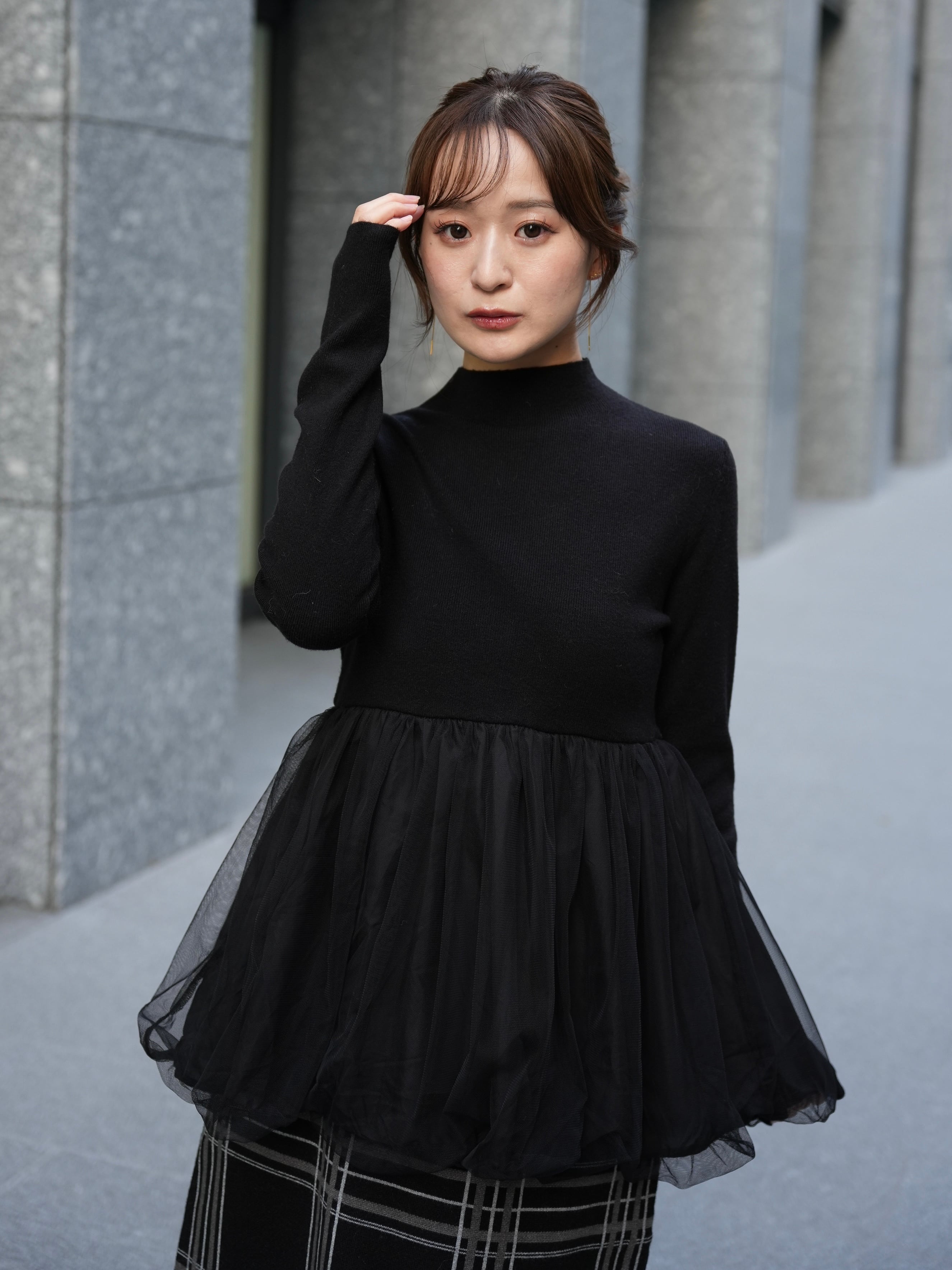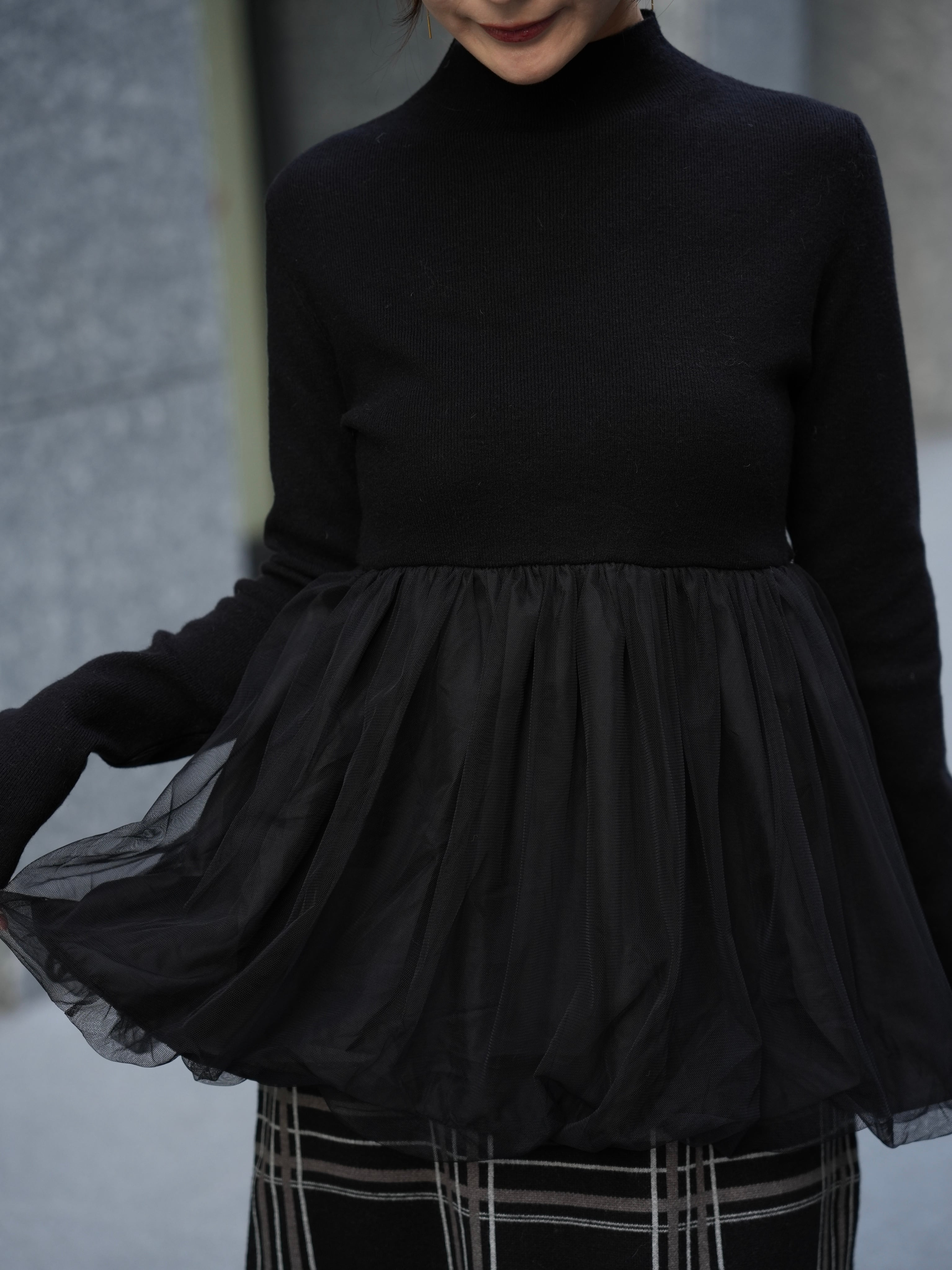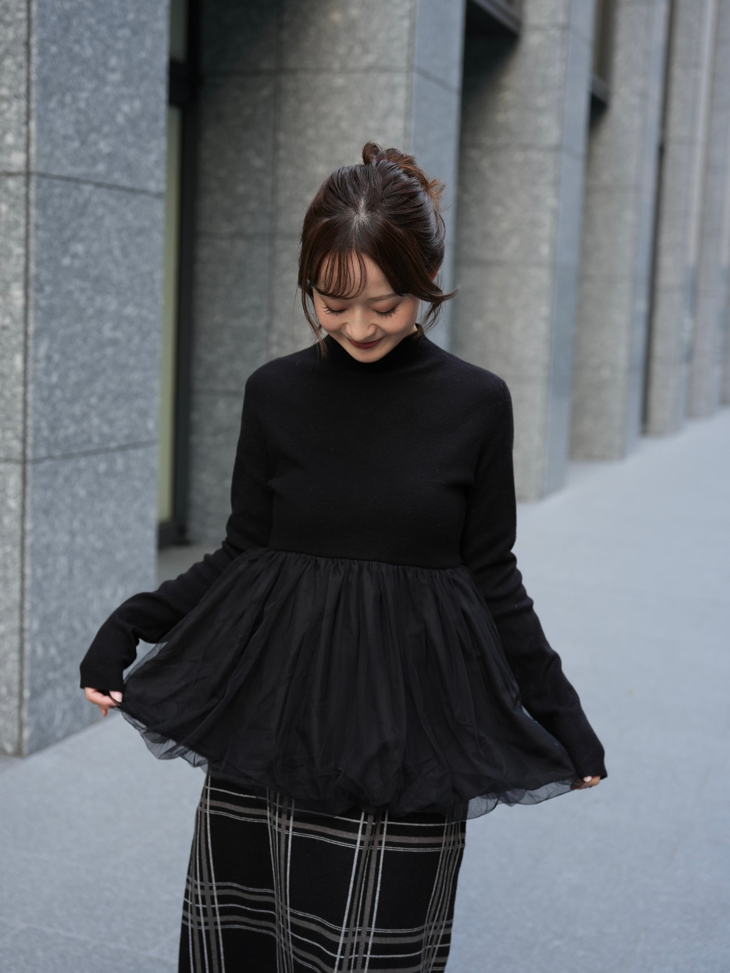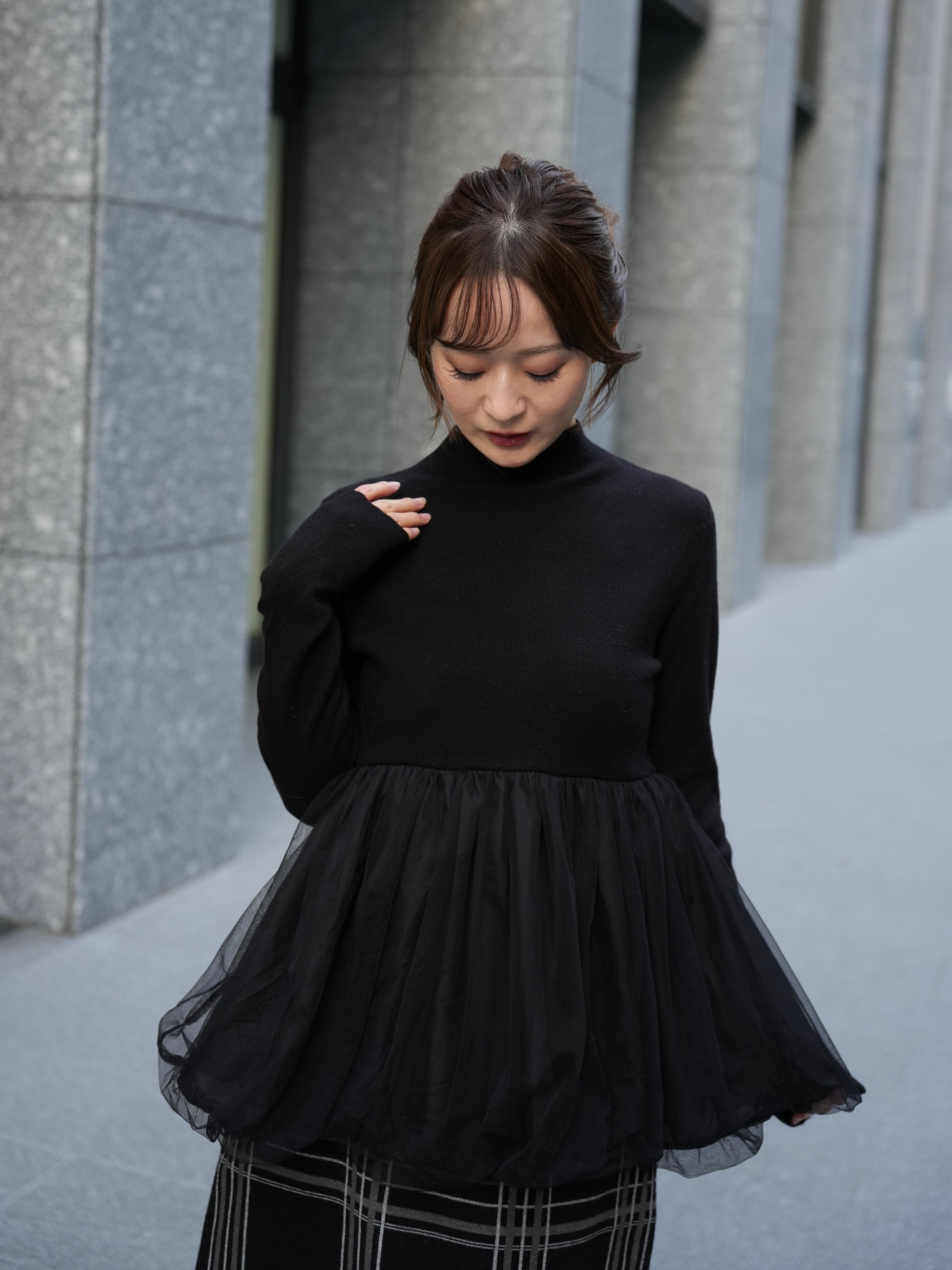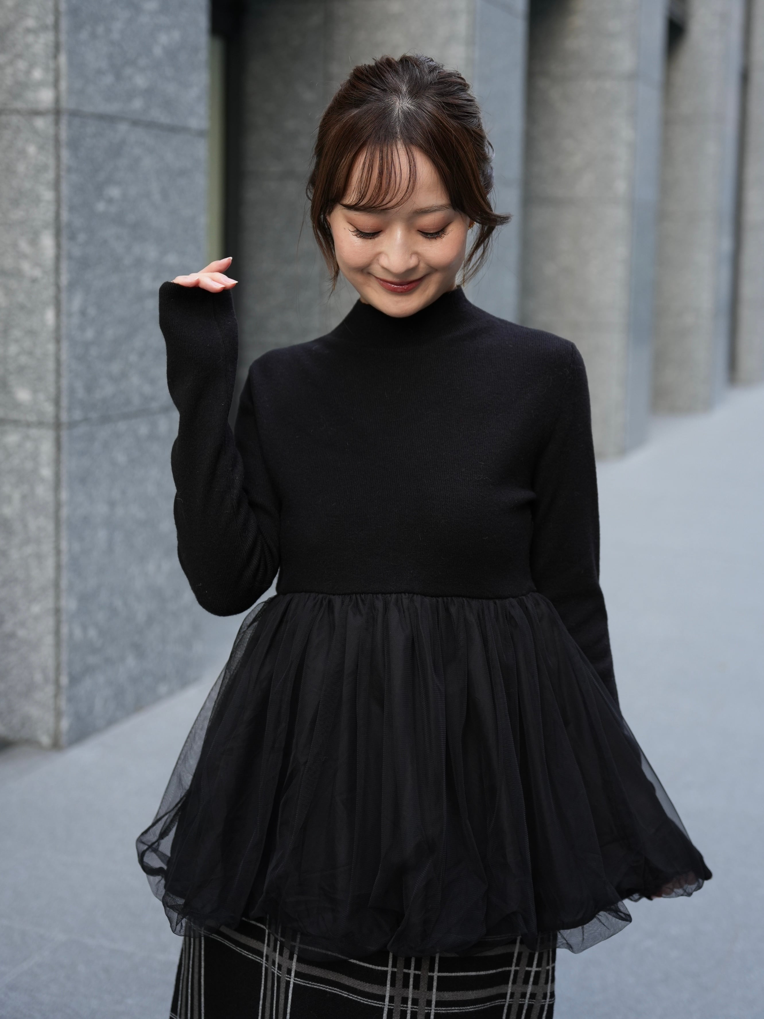 「女性らしさを引き立てる、ハイネックバルーンペプラムニット」