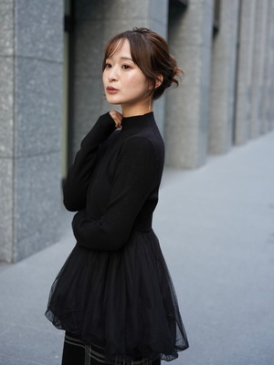優れたフィット感が体のラインを美しく見せ、やわらかなチュールのドッキングが華やかさを演出。