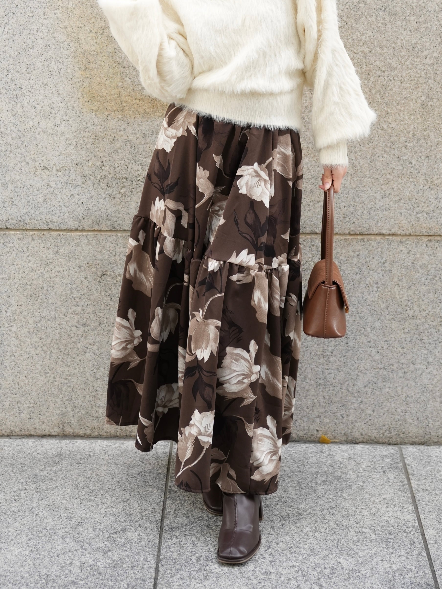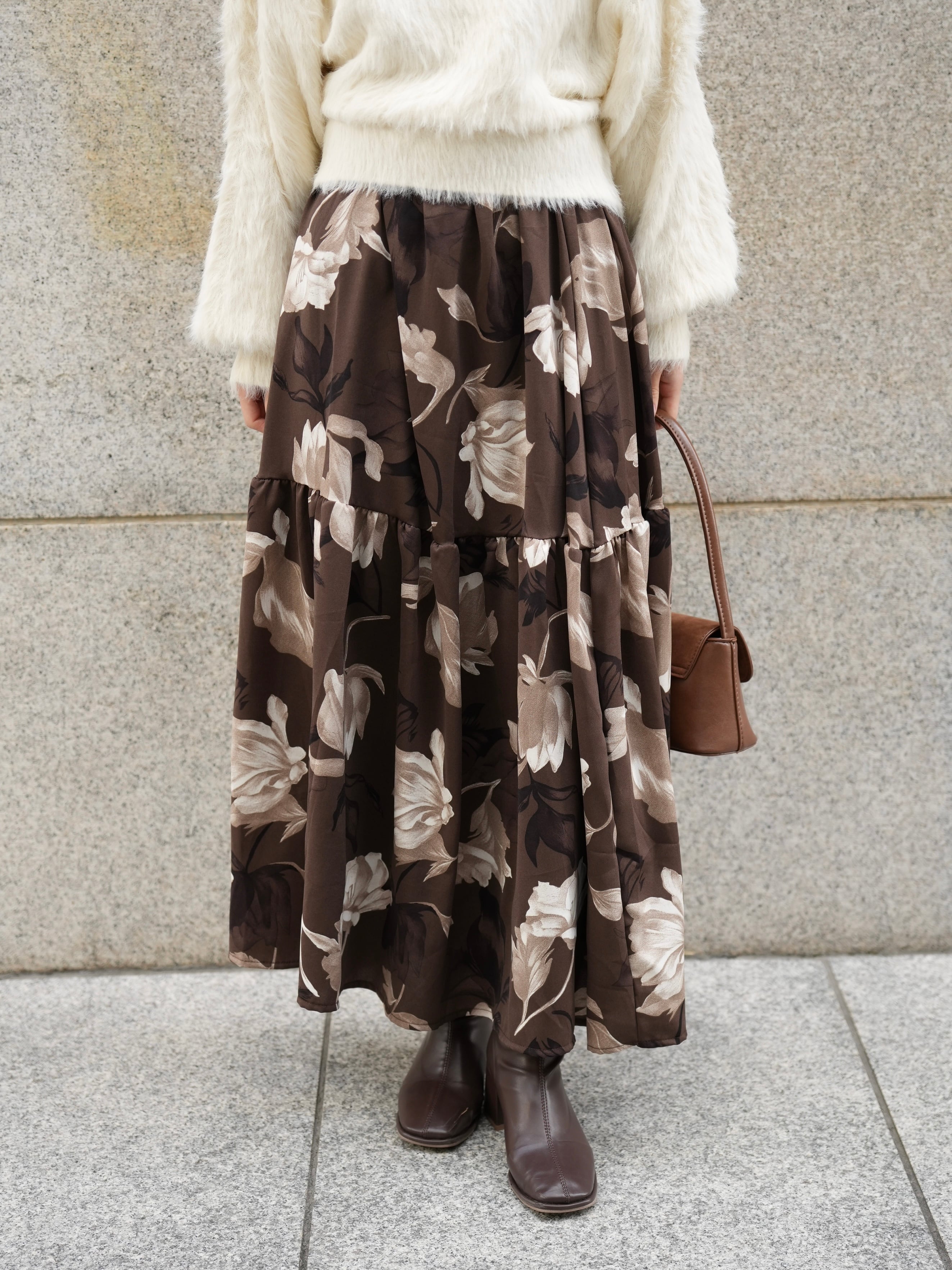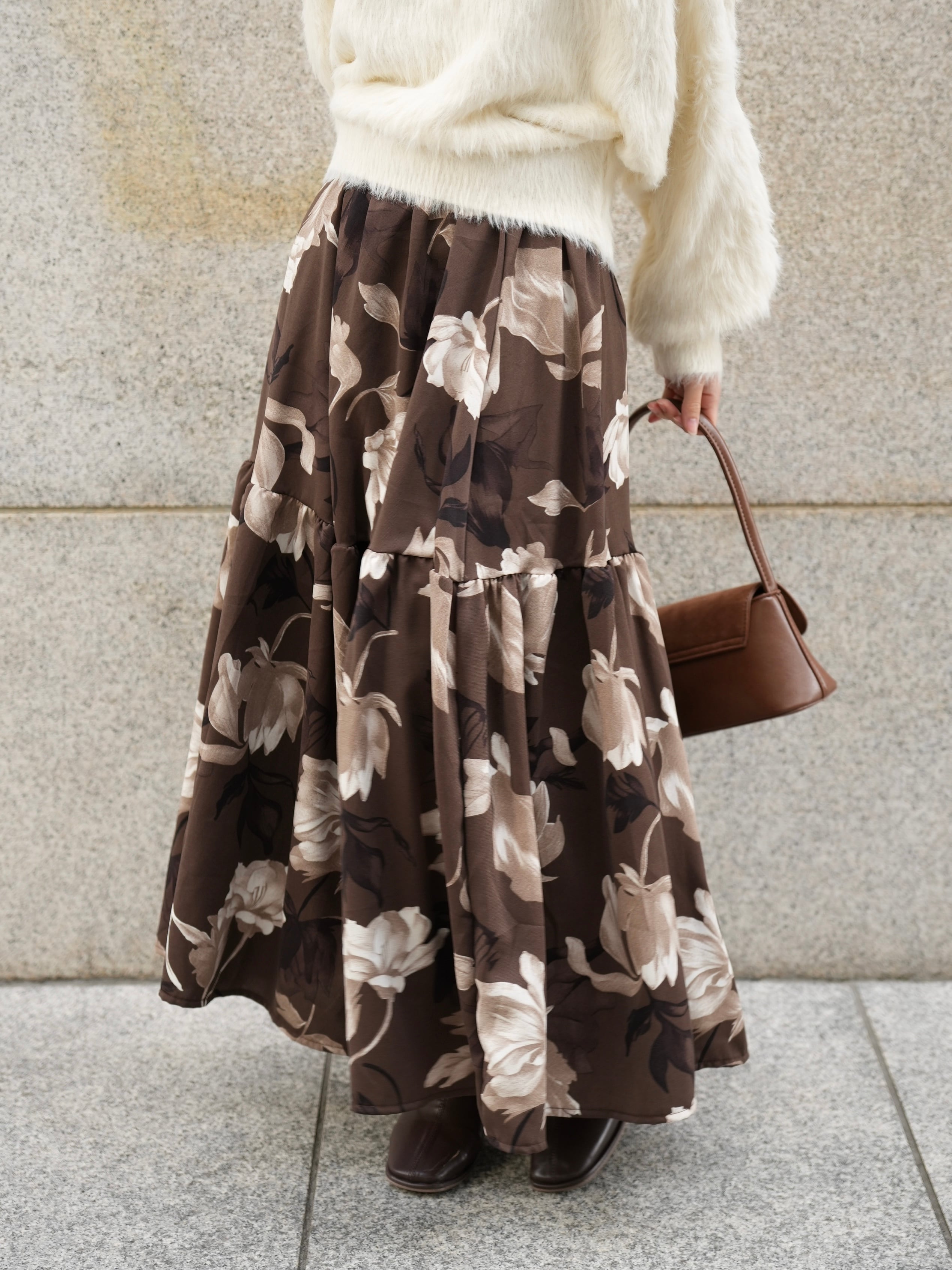 「華やかな印象を纏う、大柄フラワープリントのフラワーティアードスカート」