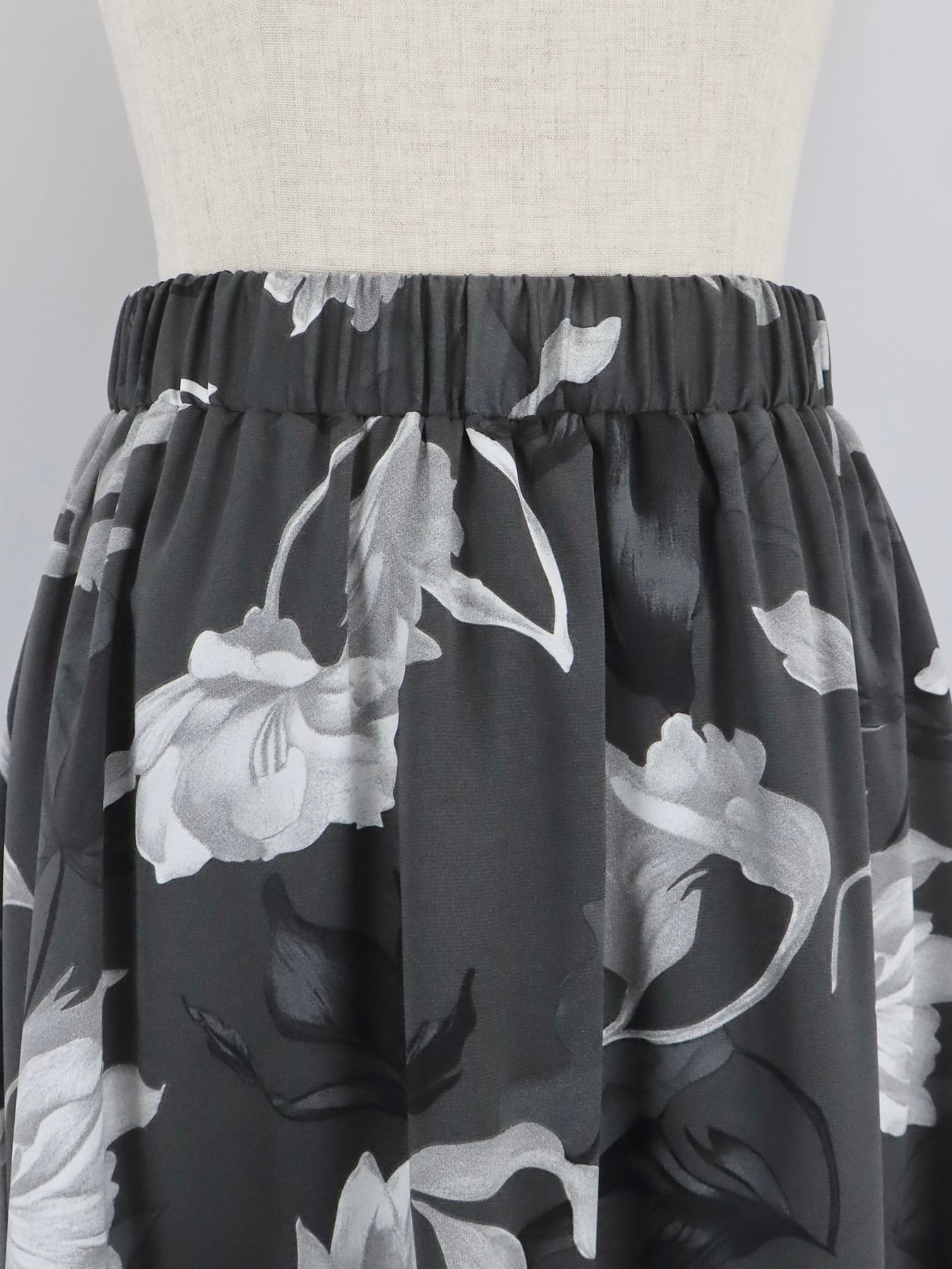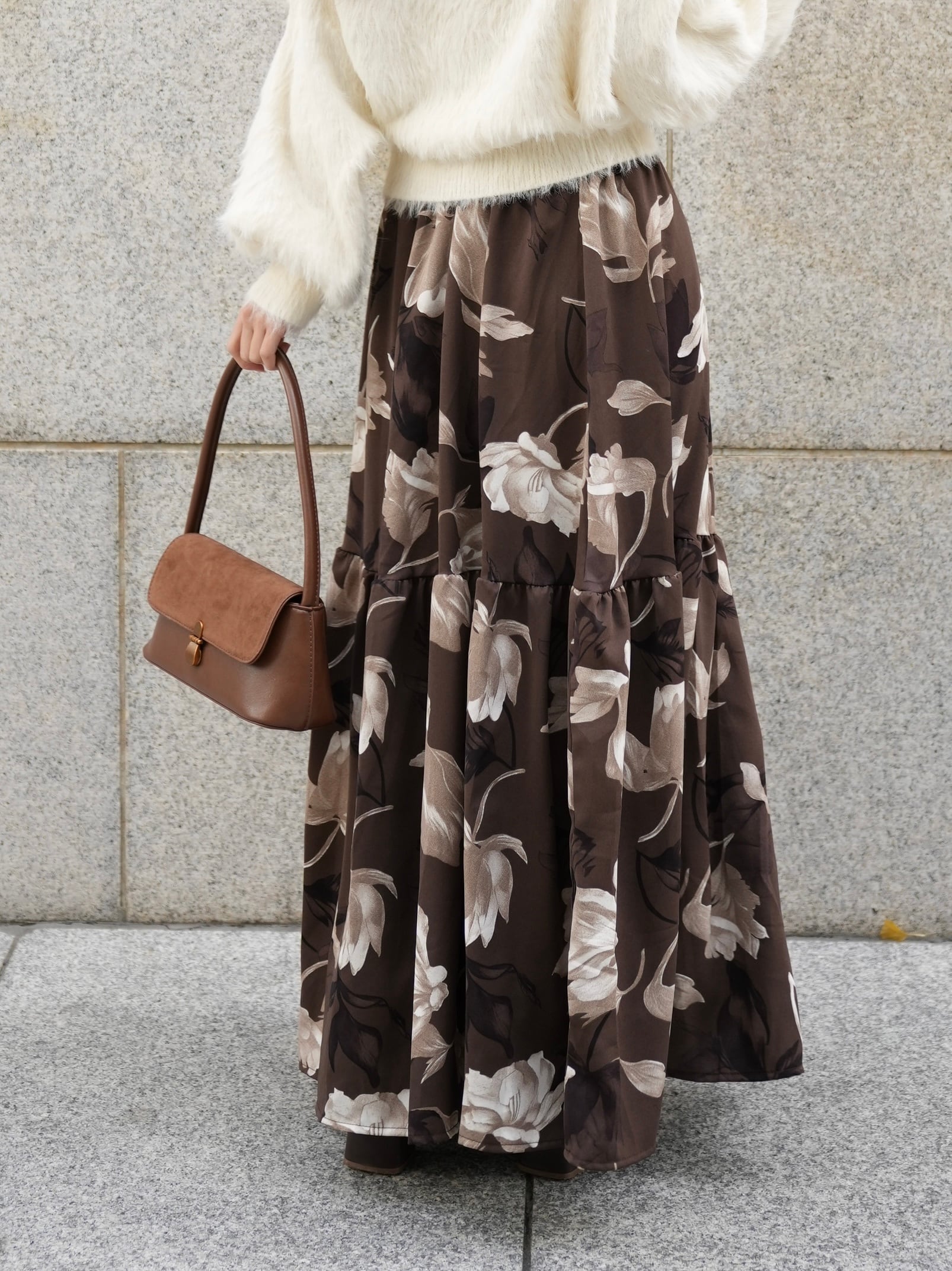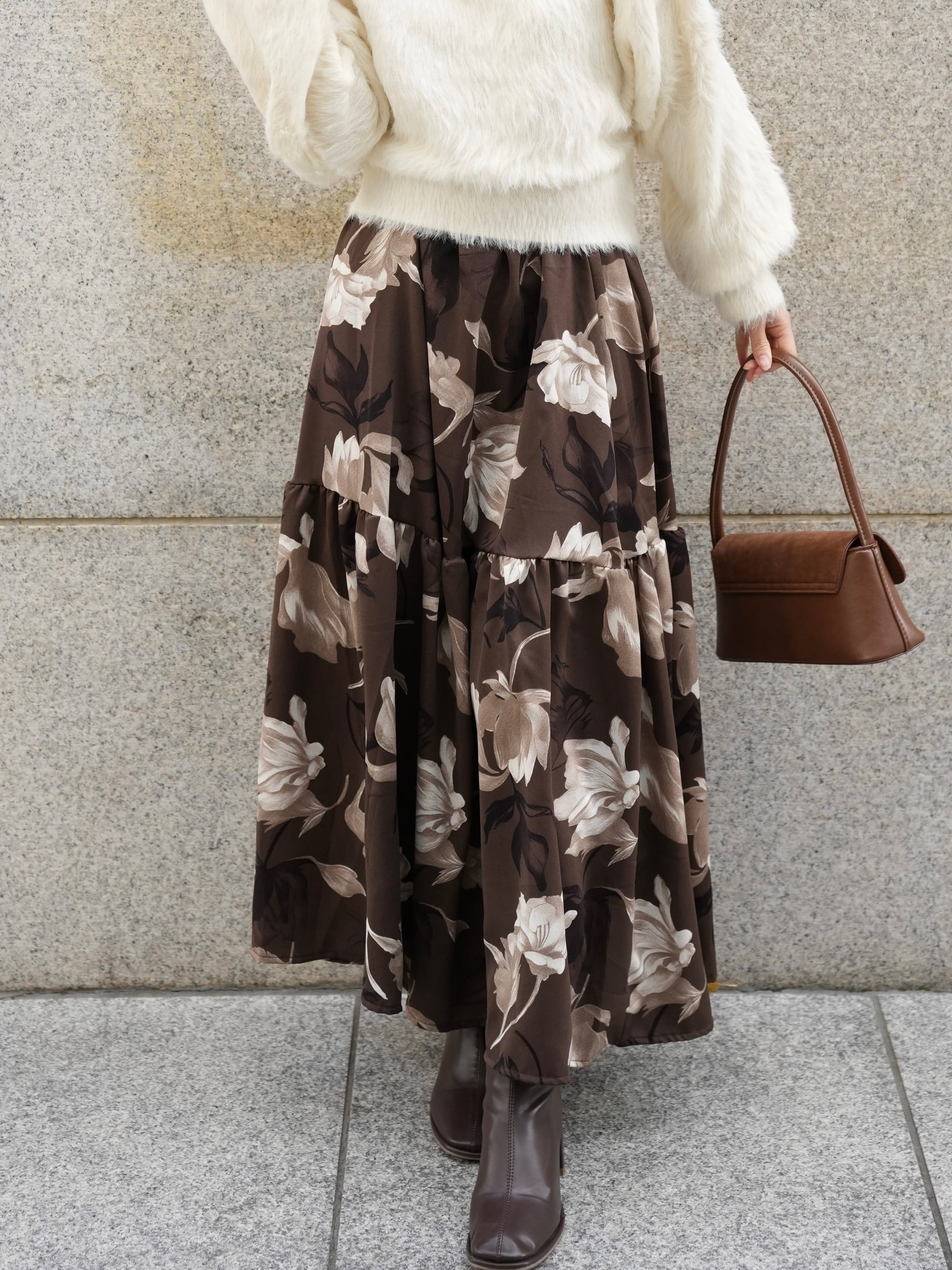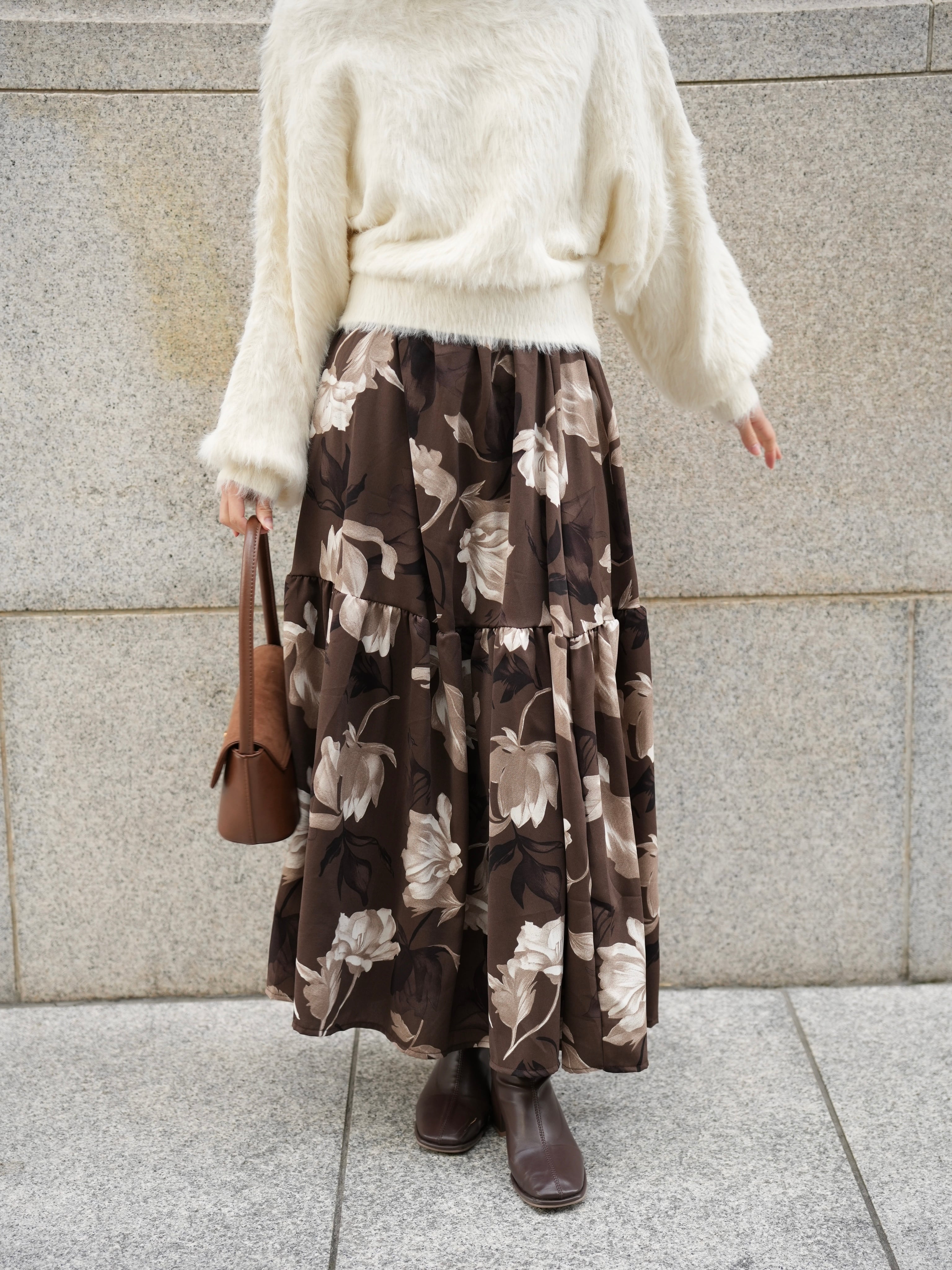 「華やかな印象を纏う、大柄フラワープリントのフラワーティアードスカート」