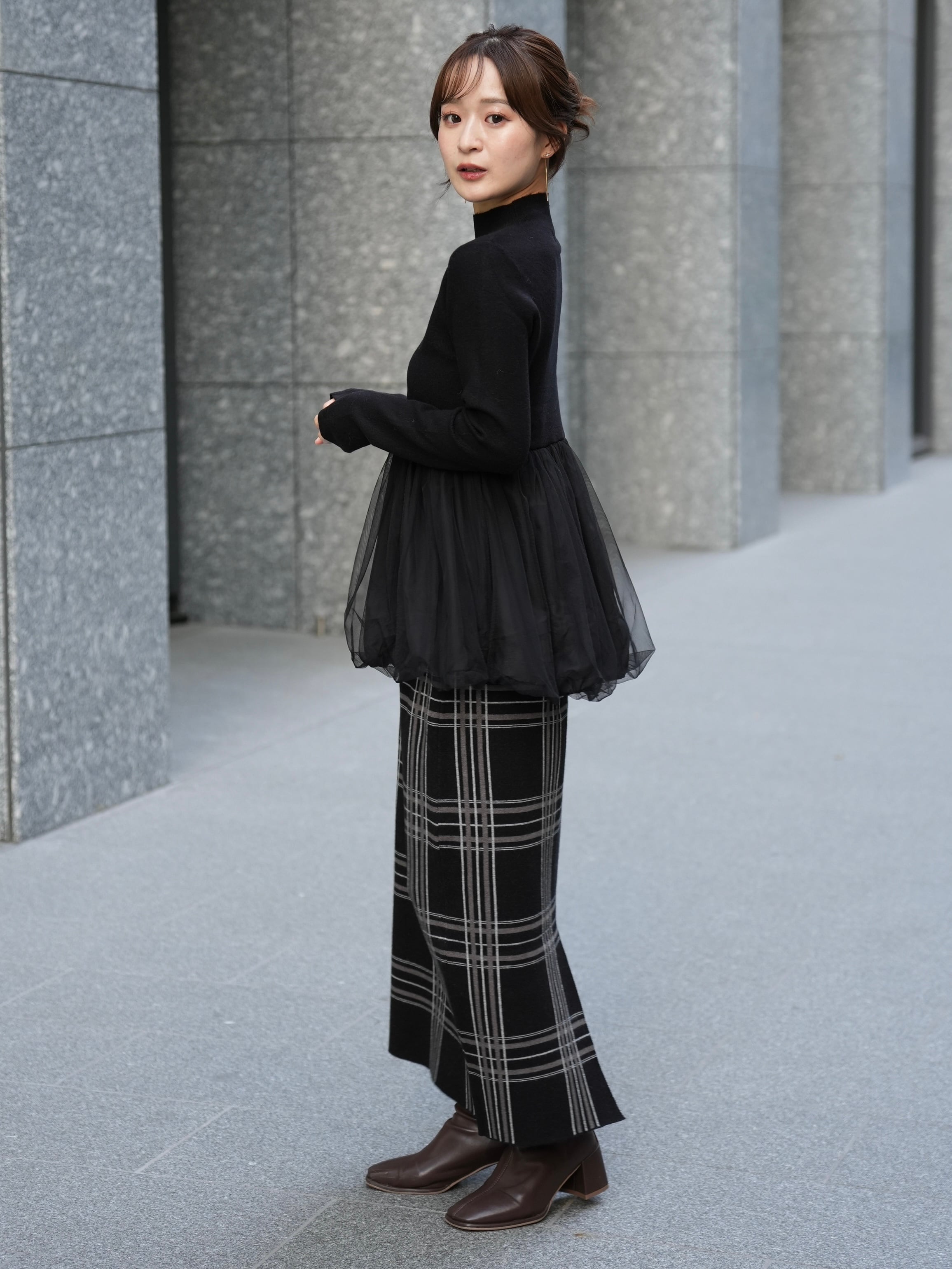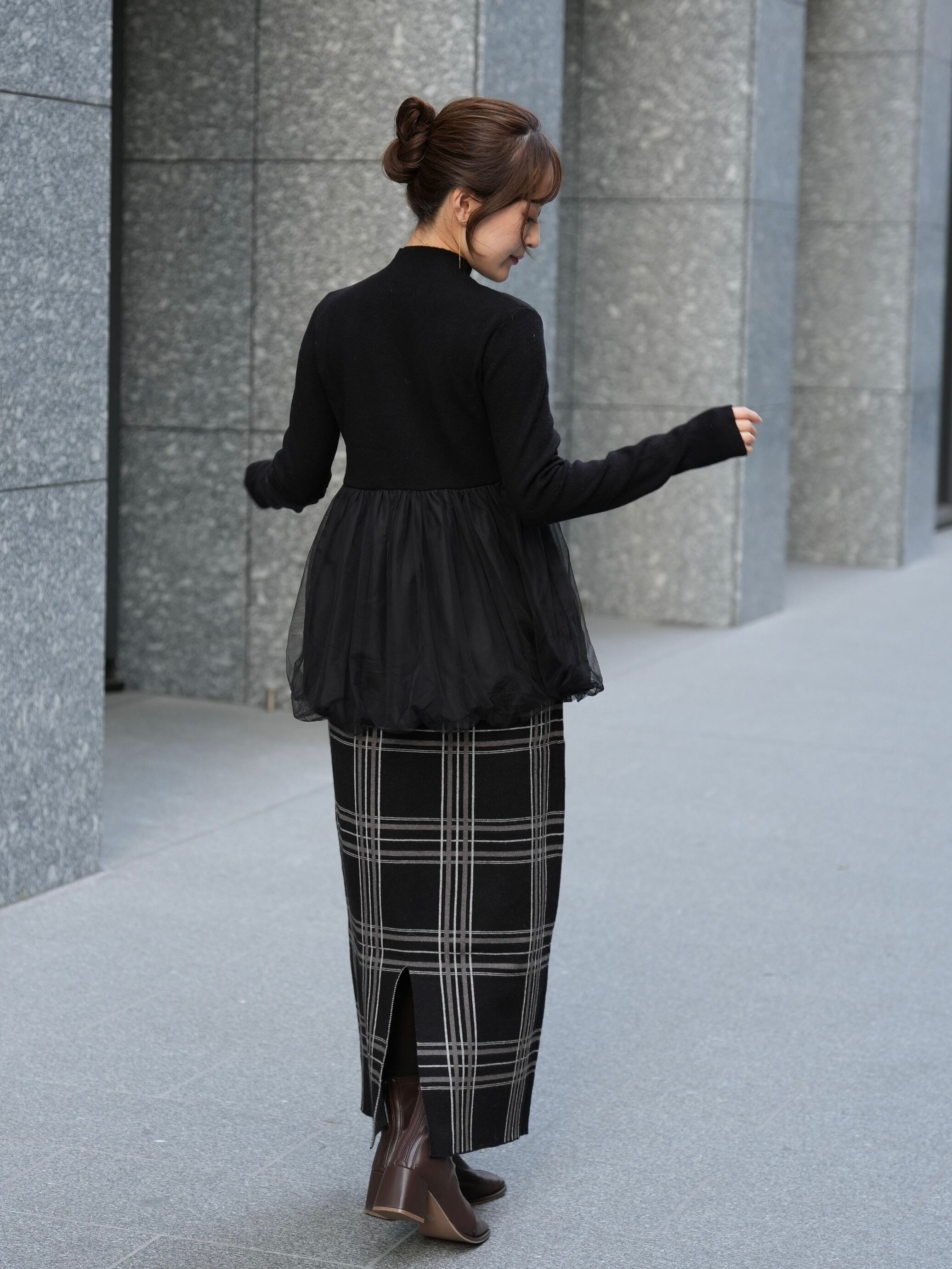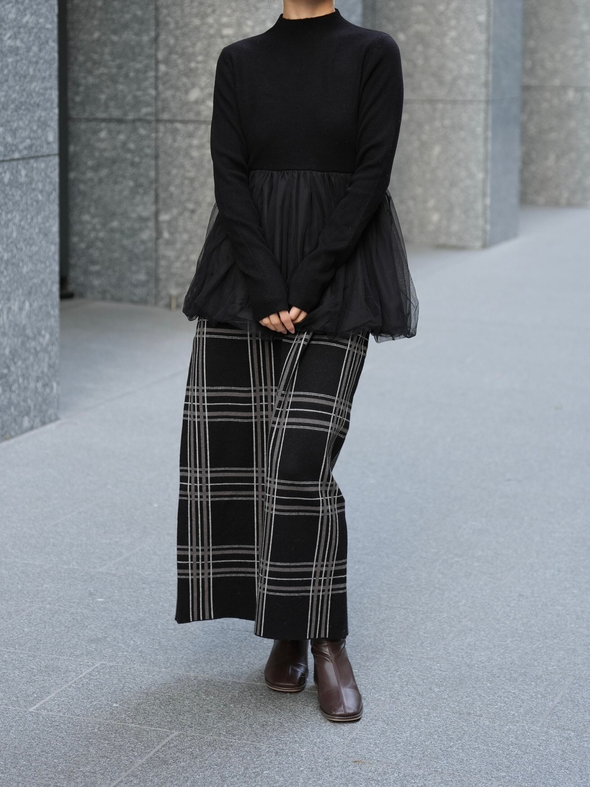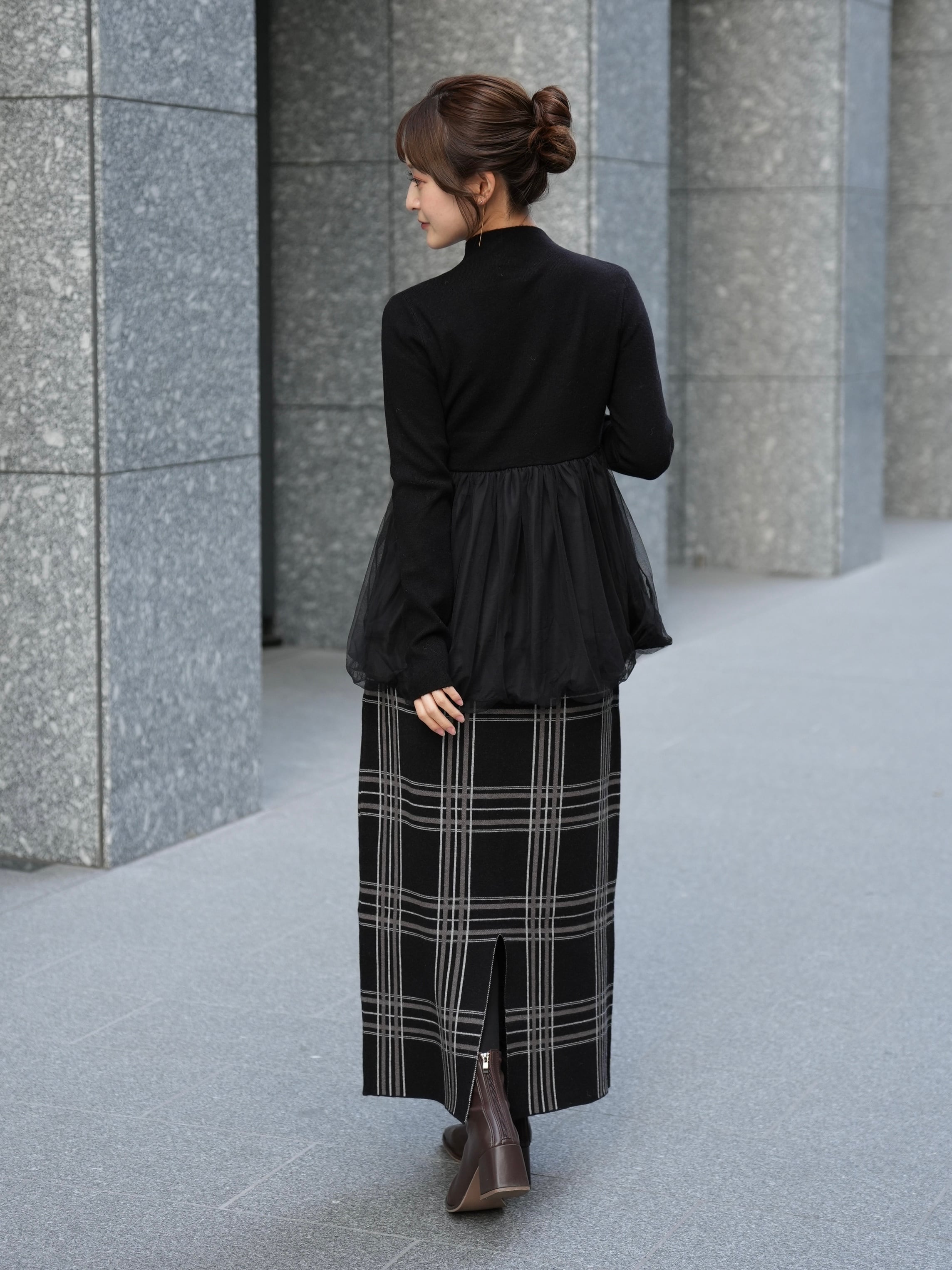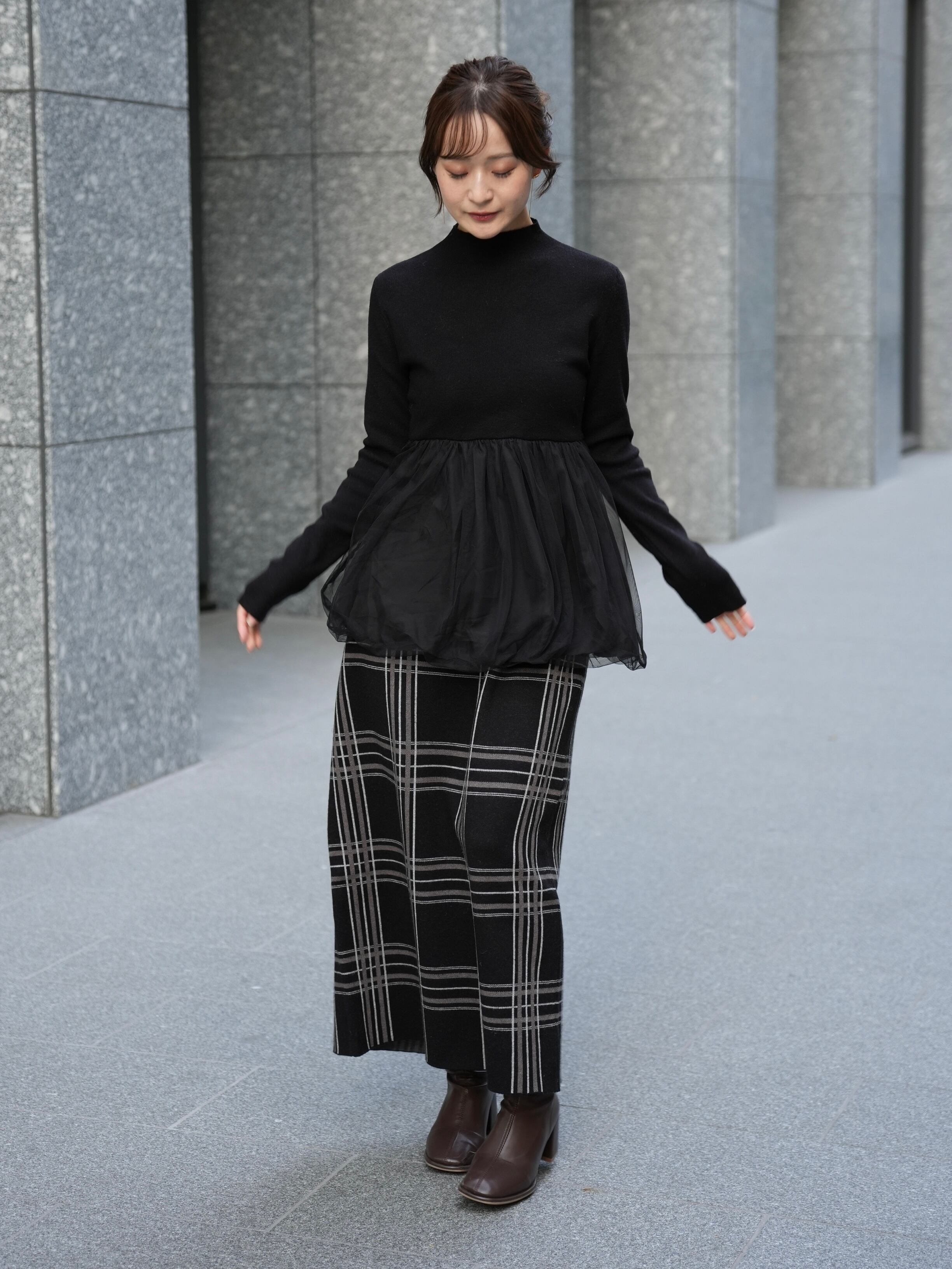 「洗練されたスタイルを実現する、チェックニットタイトスカート」